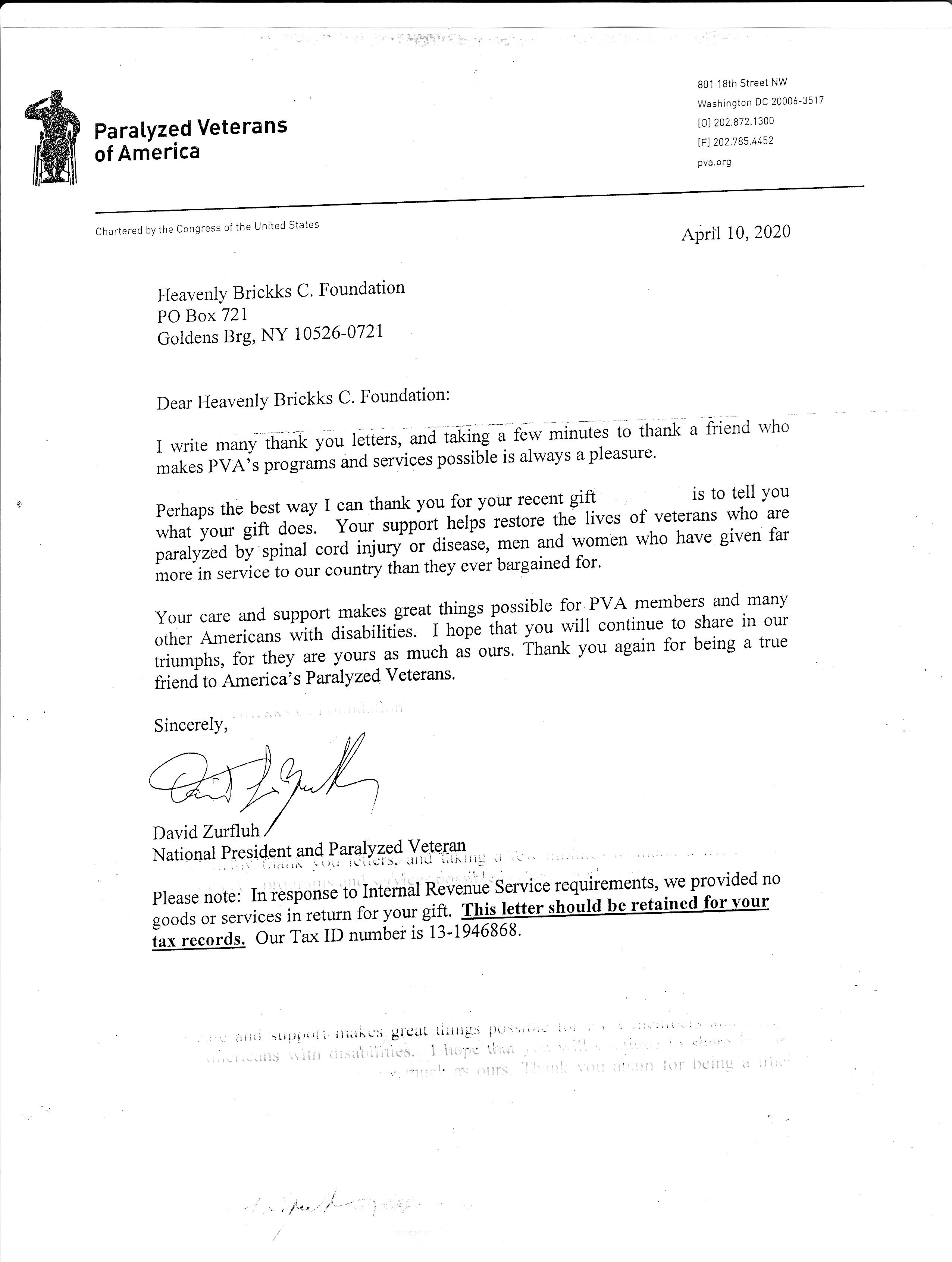 HB's April 2020 Donation to Paralyzed Veterans of America |