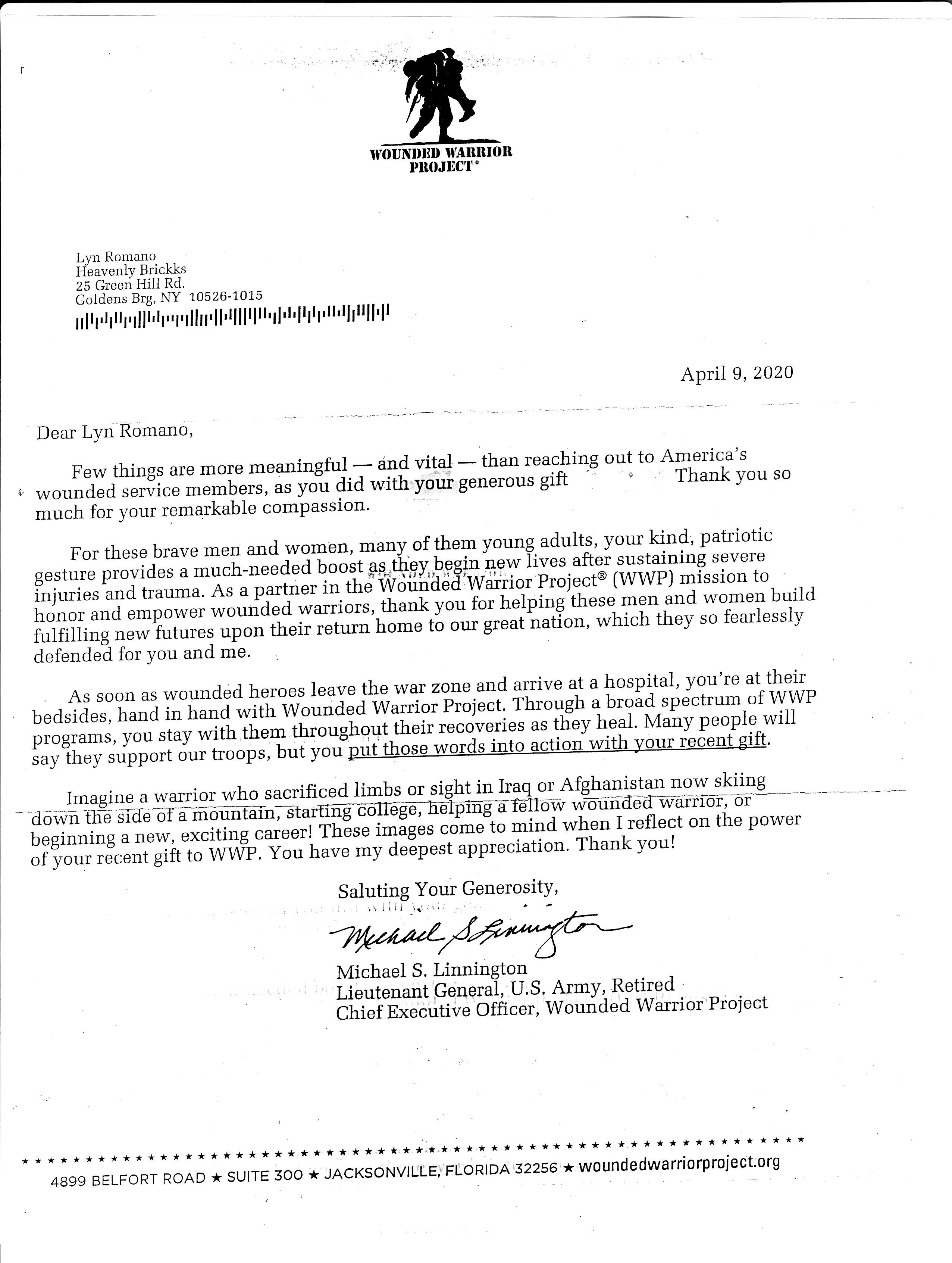 HB's 21Nov 2019 Gift to The Wounded Warrior Project |